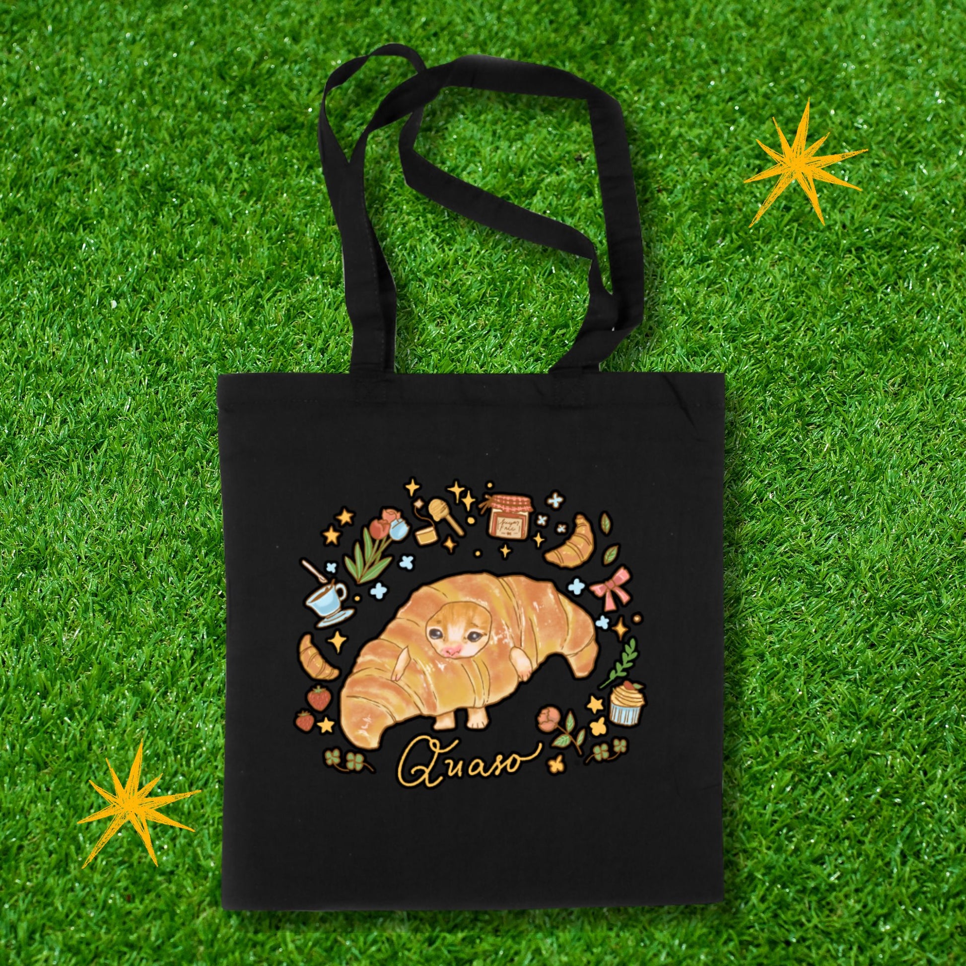 Materials: DTF Printed. The design is printed on a black canvas tote bag.